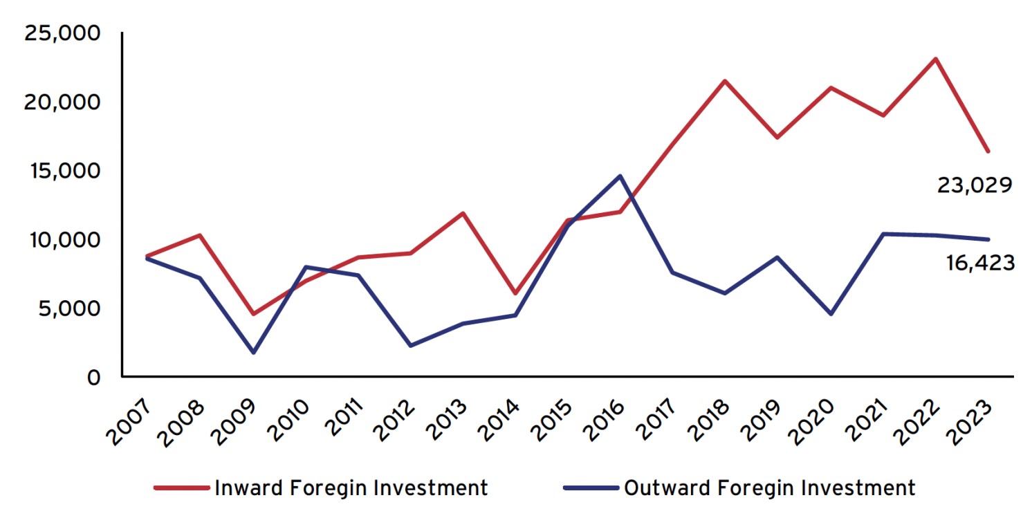 2007~2023년 이스라엘의 FDI: 유입 및 유출액(미화 수십억 달러)