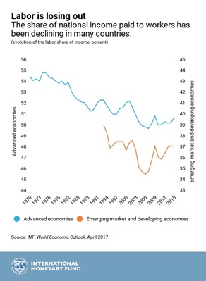 먼저 나쁜 소식이 있다. 1980년대부터 모든 주요국 정부가 신자유주의 정책을 시행하고 다른 나라에서도 이를 따르면서 대부분의 국가에서 국민 소득에서 노동이 차지하는 비중이 감소했다.