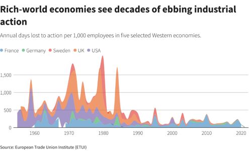 집단적 노동 조직의 약화로 인해 노동자들이 직장에서 자신의 권리를 방어하고 더 나은 임금과 조건을 얻을 수 있는 능력도 후퇴했다. 노사 분쟁 수준은 급격히 감소했다. 2020년 팬데믹 침체 이전, 주요 '부자' 경제에서 노사 분쟁으로 인한 연간 손실 일수는 사상 최저치에 가까웠다.