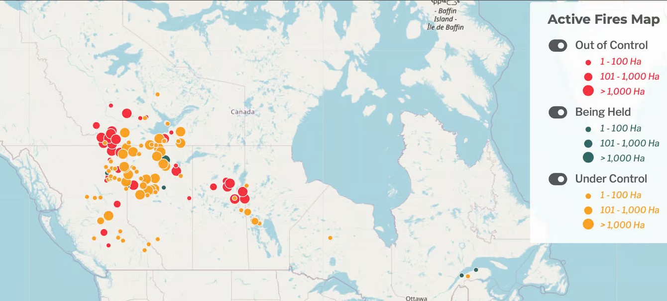 2024년 5월 14일 현재 캐나다 서부에서 발생한 화재. 화재가 지역사회를 침범함에 따라 노스웨스트 준주, BC주, 앨버타주, 매니토바주에서 대피령이 내려졌습니다. 지도 츨처: Canadian Interagency Forest Fire Centre Inc.