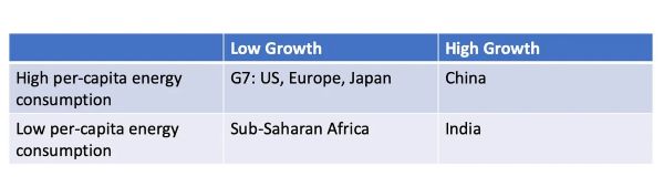 이 차트의 네 개의 상자는 서로 다른 에너지 전환을 설명하지만 양적인 측면에서 보면 매우 불균등하다. 인도와 신흥국의 전력 수요 증가(오른쪽 아래)는 선진국(왼쪽 위)의 점진적인 감소로 상쇄되고 있다. 아프리카의 인구학적 발전(왼쪽 아래)은 극적이지만 전 세계 CO2 균형에 즉각적인 영향을 거의 미치지 않는다. 결과적으로 전체 '글로벌' 드라마가 실제로는 중국에서 펼쳐지고 있는 셈이다.