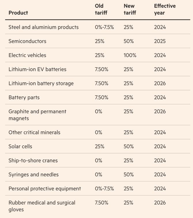 바이든의 관세는 트럼프가 2018년에 도입한 3,000억 달러 이상의 중국산 수입품에 대한 관세보다 더 표적화되어 있다그러나 중국에 대한 관세는 초당적이라는 신호이며의회의 광범위한 반중 정서를 고려할 때 관세를 철회하기는 거의 불가능할 것이다.