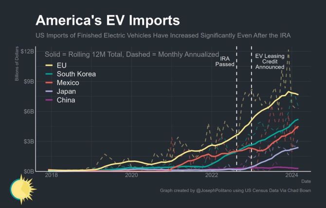 전기차에 대한 관세는 이미 27.5%(트럼프는 미국의 표준 관세 2.5%에 추가로 25%를 부과했다). 여기에 미국 국세청의 반중 세금 공제 정책이 더해지면서 중국 폴스타(중국 지리 자동차 소유)만이 중국산 전기차를 미국으로 수출하고 있다반면에 중국산 배터리는 여전히 수입되고 있지만 인플레이션 감축법의 '우려 대상 외국기업규정은 외국 기업이든 중국 기업이든 중국에서 가공한 배터리 금속이 포함된 전기차에는 3,750달러의 세금 보조금을 지급하지 못하도록 하고 있다.