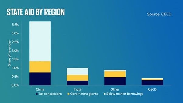 중국과 미국의 '산업 정책'에는 큰 차이가 있다. OECD의 미공개 연구에 따르면 중국 기업에 대한 중국의 국가 보조금은 OECD 국가 국가 보조금의 9배에 달한다. 중국 기업은 평균적으로 매출의 3.7%에 해당하는 정부 보조금의 혜택을 받고 있다. 이는 '부유한 세계'에 속한 국가의 평균 국가 보조금이 매출의 0.4%에 불과한 것과 비교된다.