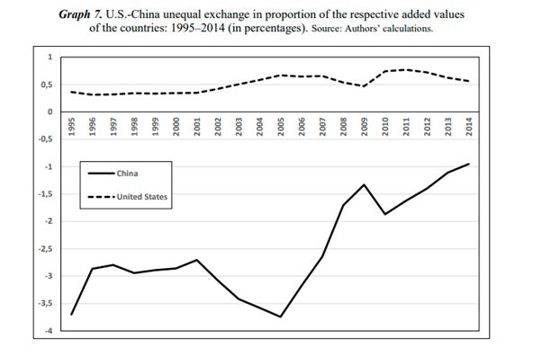 그러나 미국 자본주의는 무역 적자를 보면서도 중국으로부터 잉여 가치(UE)를 순 이전받기 때문에 지금까지는 문제가 되지 않았다. 레미 에레라, 지밍 롱, 지셴 펑, 방시 리는 세계 투입-산출표를 사용하여 "1995년부터 2014년까지 미중 무역에서 불평등이 작동했다"는 사실을 밝혀냈다. "전체적으로 국제적 가치의 이전은 주로 미국의 이익을 위해 이루어졌다. 현재 달러로 환산하면, 이 기간의 '재분배'는 미국 부가가치의 거의 0.5%에 해당하는 1,000억 달러에 달했다."