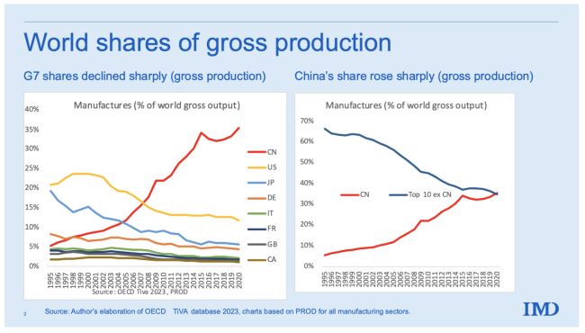 제조업, 무역, 기술에 대한 미국의 패권이 약화되고 있다. 1970년 300배에 달했던 세계 GDP에서 G7+ 국가로 구성된 제국주의 블록의 위상은 이제 중국의 두 배에 불과하다.
