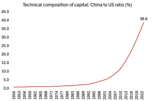 지난 40년 동안 미국과 중국의 경제적 위치의 상대적 변화를 가치 측면에서 측정할 수 있다. 마르크스주의 경제 이론에서는 먼저 자본의 기술적 구성(TCC)을 통해 그 관계를 살펴본다. 자본의 기술적 구성은 고용된 노동자 1인당 고정 자산(기계, 구조물 등)의 양을 화폐로 측정한다. 1990년대 초만 해도 중국의 자본의 기술적 구성(TCC)는 미국 경제의 3%에 불과했지만, 최근 추산에 따르면 38%를 넘어섰다. 아직 동등하지는 않지만 현재 속도로 보면 중국은 길어야 20년 안에 격차를 좁힐 수 있을 것이다.