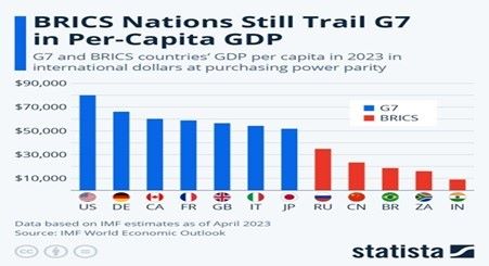 1인당 GDP에서 여전히 G7을 뒤쫓는 BRICS 국가들