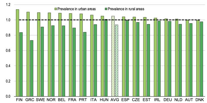 참고: 스페인에서는 오염도가 높은 일자리가 전국보다 농촌 지역에서 두 배 이상 많은 반면, 도시 지역에서는 절반에 불과하다. 출처: EULFS 및 저자 계산.