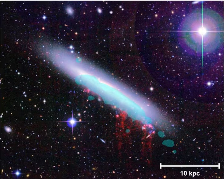 처녀자리 성단의 일부인 나선 은하 NGC 4330의 이미지뜨겁고 감압된 가스는 빨간색으로 표시되고 파란색 층은 새로운 별 형성에 적합한 가스를 나타낸다. Fossatie . (2018), 저자 제공