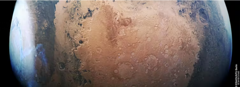 화성 익스프레스(ESA)가 촬영한 화성 이미지왼쪽에는 북극이 표시되어 있으며 테라 사바에아와 아라비아 테라 지역이 보인다오른쪽은 화성의 남극이다. ESA/DLR/FU 베를린, CC BY-NC-SA