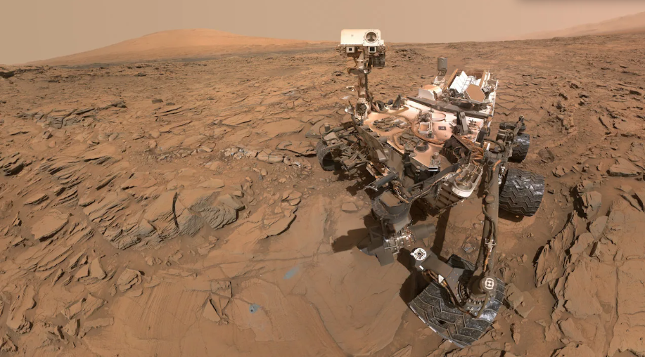 NASA의 큐리오시티 화성 탐사선의 자화상은 샤프산 하부의 '나우클루프트 고원'에 있는 '오코루소'라는 시추 샘플 지점에 있는 탐사선의 모습을 보여준다이 장면은 2016년 5월 11일에 로버의 화성 핸드 렌즈 이미저(MAHLI)로 촬영한 여러 이미지를 결합한 것이다. NASA/JPL-CALTECH/MSSS