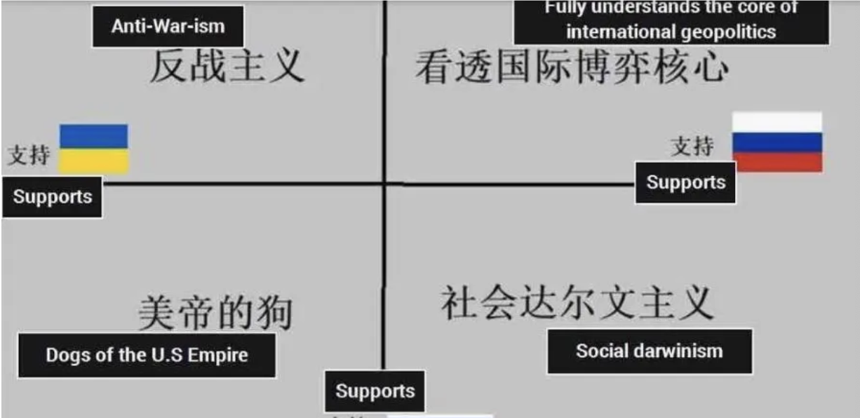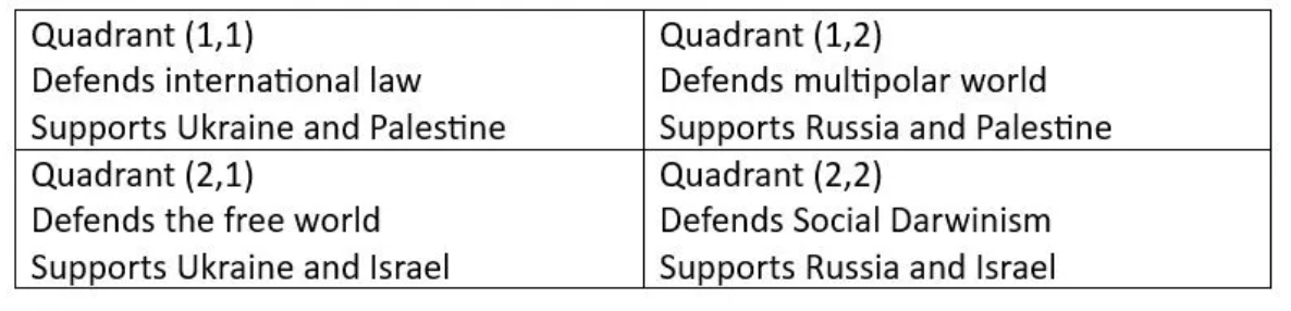 최근 한 중국 저자(글과, 글에서 사용된 한자로 추측하길)가 국제 관계에 대해 다음과 같은 해석을 제안했다. 그는 (내가 생각하기에 많은 사람들이 그렇듯) 현재 진행 중인 두 전쟁과 관련하여 흥미로운 2×2 이념적 연합이 형성되었음에 주목한다. 이 연합은 팔레스타인과 우크라이나를 지지하는 사람들, 이스라엘과 우크라이나를 지지하는 사람들, 러시아와 팔레스타인을 지지하는 사람들, 그리고 러시아와 이스라엘을 지지하는 사람들로 나뉜다. 언뜻 보아도 흥미로운 것은, 네 개의 사분면 중 어느 것도 비어 있지 않으며, 각각을 옹호하는 논리가 있다는 것이다. 저자는 네 진영의 이름까지 제안하기도 했는데, 나는 경우에 따라 더 나은 이해를 위해 그 이름들을 바꾸어 보고 싶다.