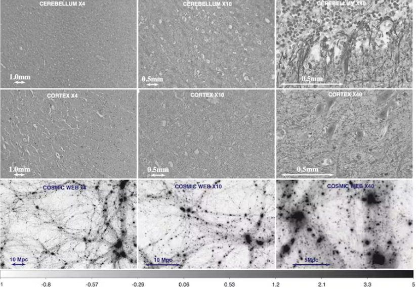 분석 중 하나는 1마이크로미터에서 0.1밀리미터 규모의 소뇌 신경망 내 변동 분포가 우주 거미줄의 물질 분포와 동일한 진행 과정을 따르지만, 물론 5백만에서 5억 광년에 이르는 더 큰 규모에서도 마찬가지라는 것을 보여주었다.