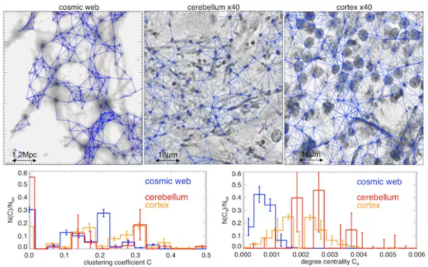 우주와 뇌의 규모는 27조 배나 차이가 나지만(즉, 우주는 우리 뇌보다 10의 33승 배 더 크다), 두 가지를 분석한 결과 서로 다른 물리적 과정이 복잡성과 자기 조직화가 비슷한 구조의 출현으로 이어질 수 있다는 사실이 밝혀졌다.