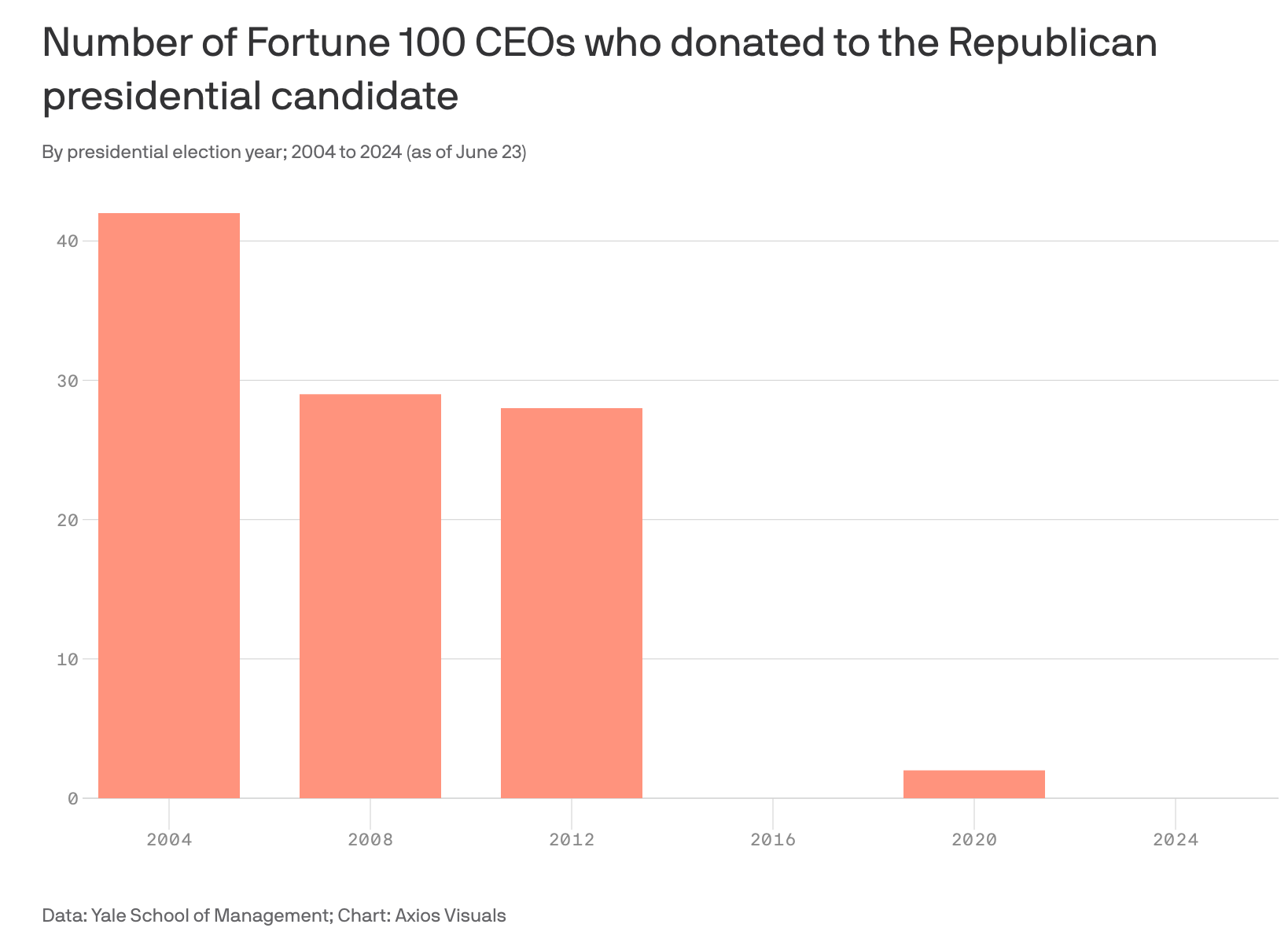 2024년 6월 말 기준, 포브스 100대 기업 중 트럼프에게 기부한 CEO는 0명이었다. 이전 차트북에서 분석한 바와 같이, 트럼프의 초부유층 기부자들은 특이한 억만장자들의 돈으로 구성되어 있다. '그' 논쟁과 암살 사건 이후에도 여전히 그러하다.