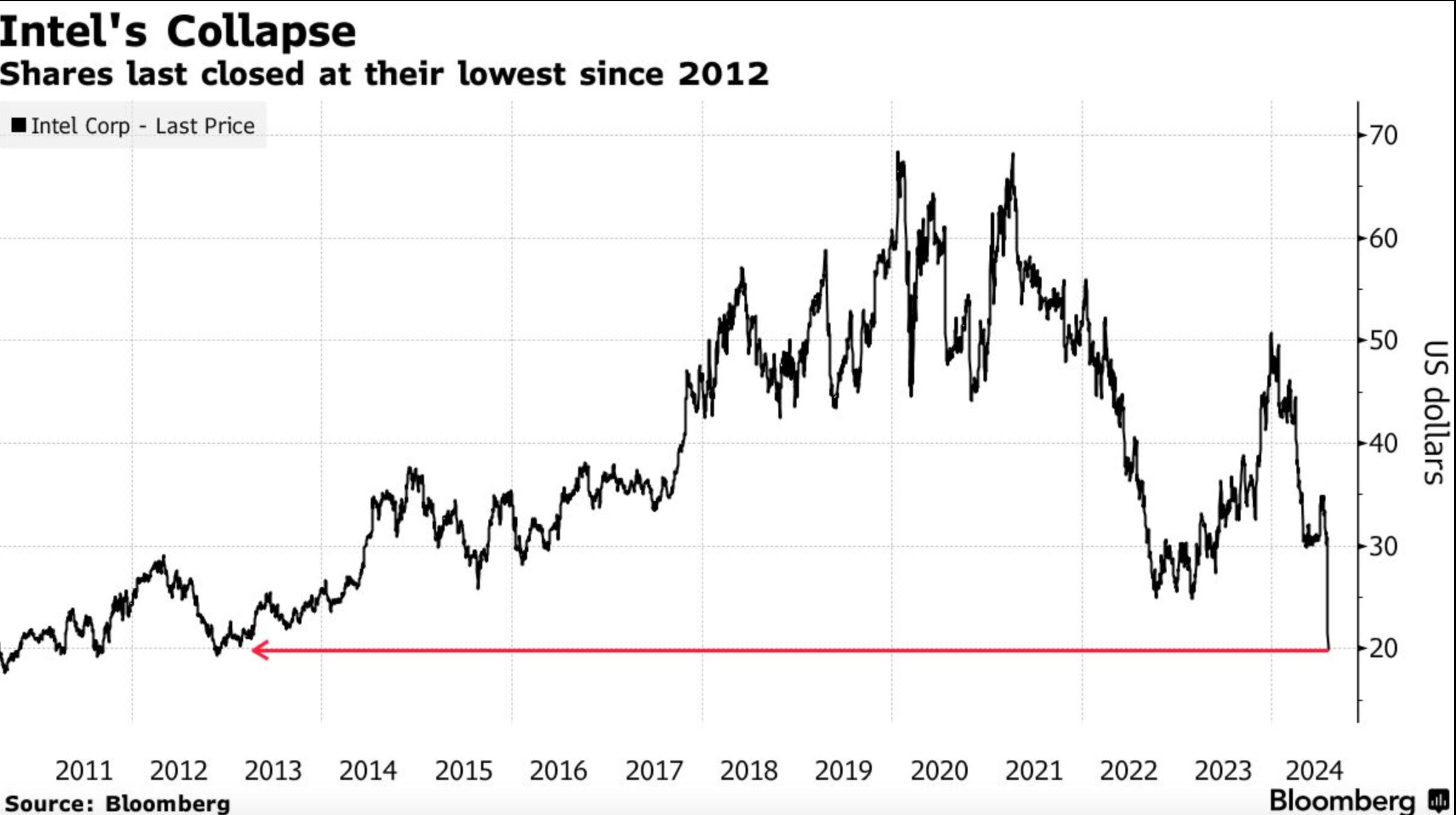 지난주 인텔은 15,000명의 인원 감축과 함께 1992년부터 지급해 온 배당금을 중단한다고 발표했다. 블룸버그에 따르면, 월스트리트는 "인내심을 잃고 있다"며 "투자자들이 킬 스위치를 누르고 있다"고 전했다. 주가는 10년 만에 최저 수준으로 급락했다.