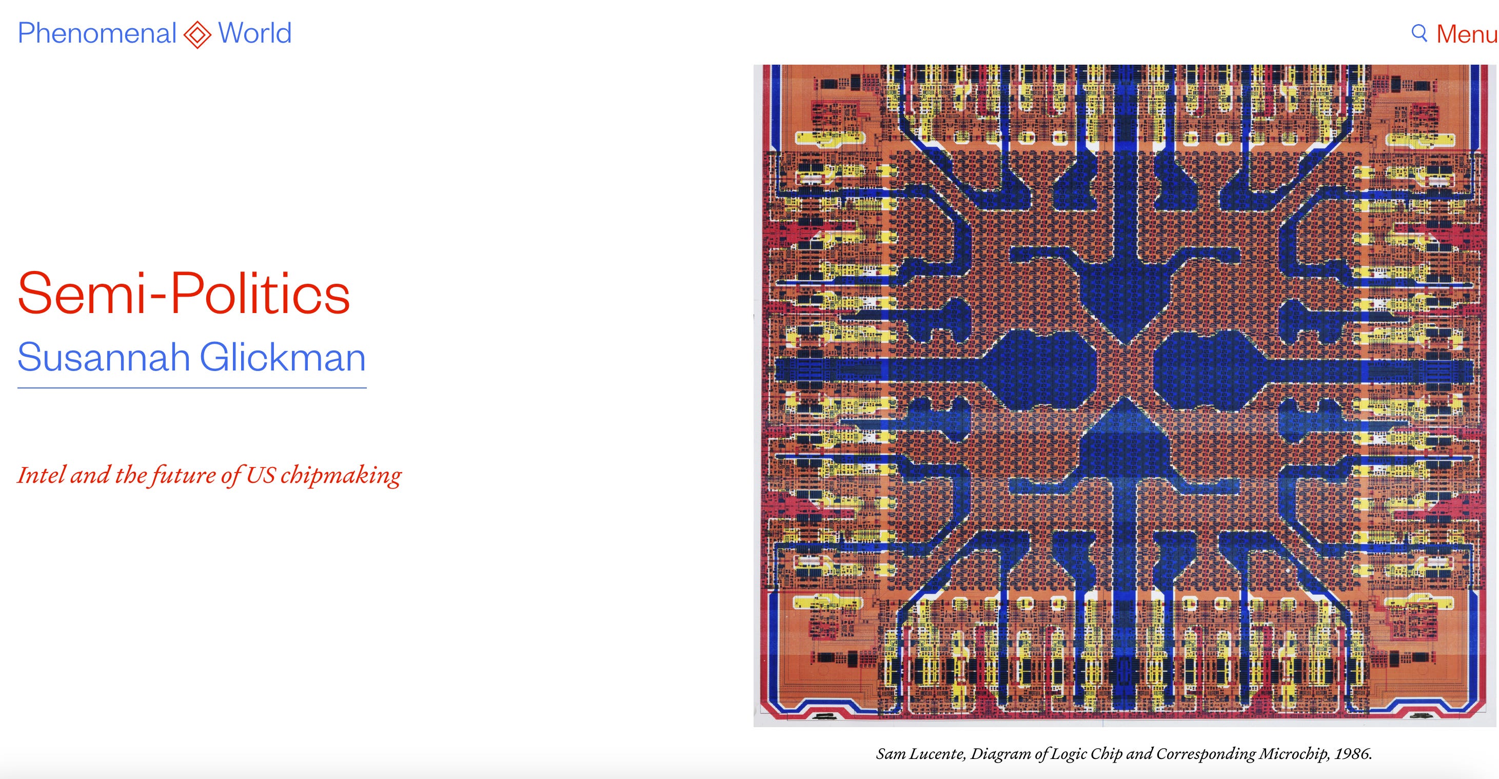 인텔은 지정학과 산업 정책이 변화하는 새로운 정치경제 환경에서 중요한 역할을 한다. 중국과의 경제적 분리를 추구하는 세계에서, 인텔은 국가를 대표하는 주요 기업으로서 자리매김하고 있다. 수잔나 글릭맨(Susanna Glickman)이 Phenomenal World에서 설명했듯이, 인텔은 1960년대 후반부터 전 세계 하이테크 산업의 중심에서 칩 제조와 정치경제에 큰 영향을 미쳐왔다.