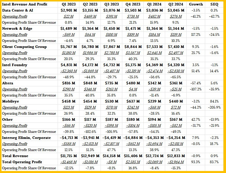 "2분기에 인텔의 매출은 지난해 같은 기간에 비해 9/10포인트 줄어든 128억 3천만 달러였고, 영업 손실은 거의 두 배로 늘어나 19억 6천만 달러에 달했다. 인텔은 이번 분기에 순이익이 아닌 영업이익만 집계했는데, 자회사 간의 내부 거래가 많았기 때문이다. 인텔은 이번 분기에 113억 달러의 현금과 약 180억 달러의 단기 투자금을 보유하고 있지만, 이는 팹 1.5개를 운영할 정도로 충분한 자본일 뿐, TSMC와 같은 세계 2위 규모의 파운드리와 경쟁하기에는 부족하다."
