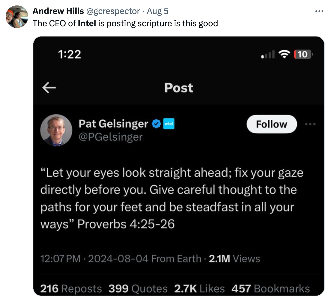 인공지능과 엔비디아, 팹 7에 대한 시장의 관심, 그리고 미국 부통령 후보와 관련된 정치적 관심이 집중되는 가운데, 지난주 인텔이 발표한 재앙적인 소식이 묻혀 버릴까 우려된다.
