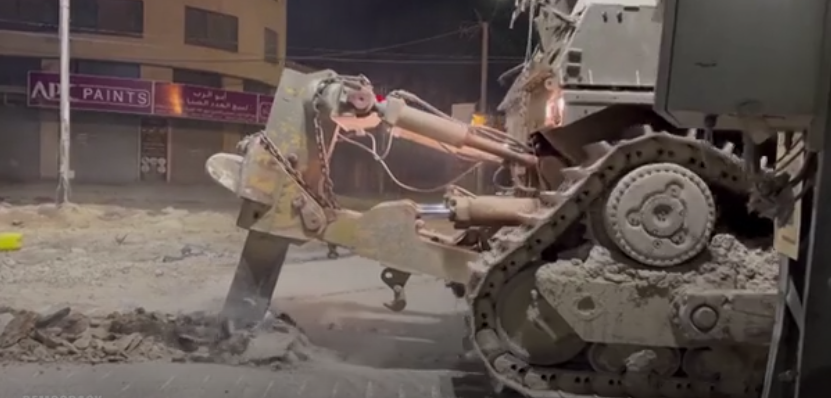 이스라엘군이 장갑차, 불도저로 서안지구 시설을 파괴하고 있다. 출처: democracy now 동영상 캡처