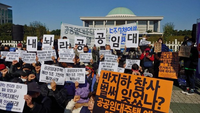 2023년 공공임대주택 예산을 대폭 삭감한 윤석열 정부에 맞서 싸우는 사람들
