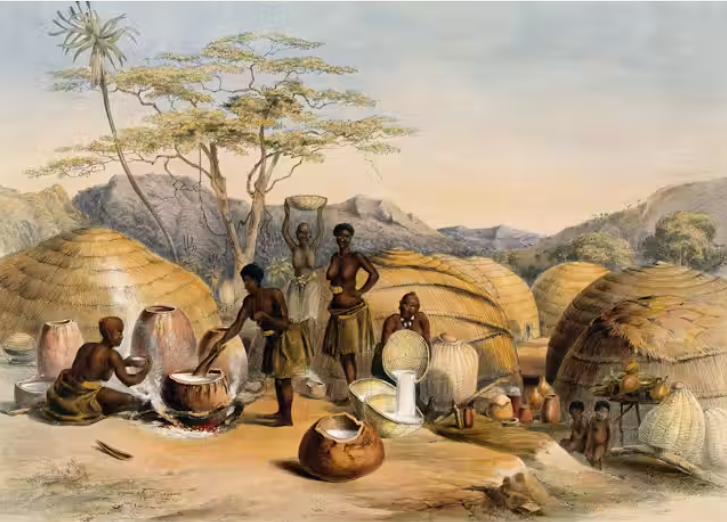 맥주를 양조하는 줄루족 여성들. 1849년, 컬러 석판화. George-French Angas, CC BY.