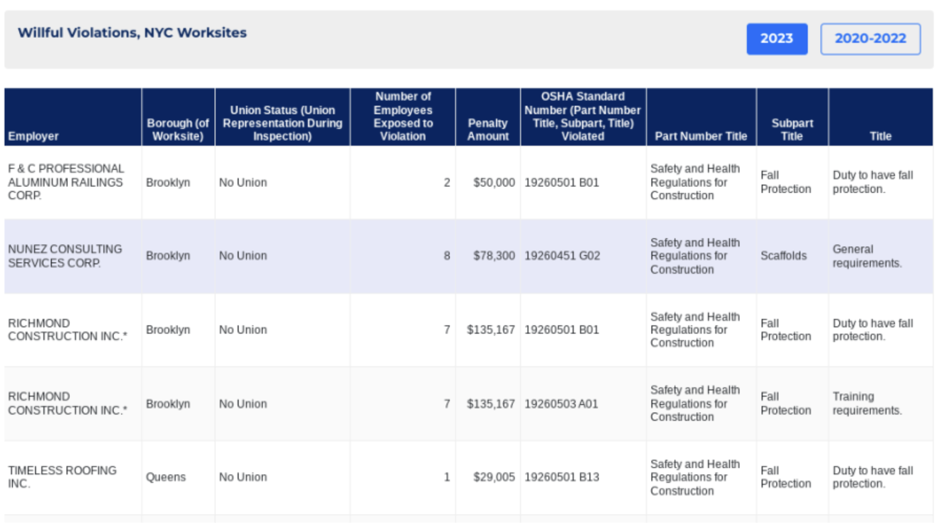 출처: 직장 안전 위반 회사들을 표시한 뉴욕 노동(법규) 위반 대시보드 화면 갈무리