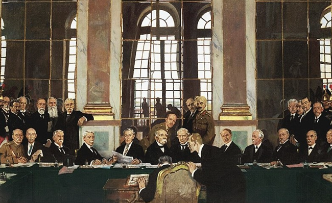 1919년 6월 28일 베르사유 궁전 거울의 방에서 이뤄진 평화조약 서명식. 출처: 영국 임페리얼 전쟁 박물관