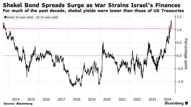 지난 10년 동안 셰켈 채권 수익률(이스라엘의 통화인 '셰켈'로 발행된 채권의 이자율)은 미국 국채 수익률보다 낮았으나 이제는 그렇지 않다.