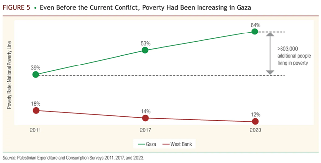 세계은행에 따르면 전쟁으로 인한 피해만 반영해도 2023년 마지막 분기 가자지구의 GDP는 2022년 마지막 분기보다 86% 감소했으며, 현재 가자지구 주민의 95%가 식량 불안에 시달리고 있다. 서안지구의 실업률은 2023년 3분기 13%에서 그해 말 32%로 급증해 사상 최고치를 기록했다. 팔레스타인 통치 당국은 재정 파탄 직전이며, 국제 위기 그룹(International Crisis Group)의 6월 분석에 따르면 상업 은행에 대한 부채와 자체 연금 기금에 대한 연체금이 110억 달러에 이른다. (출처: 카렌 E. 영 외무부)