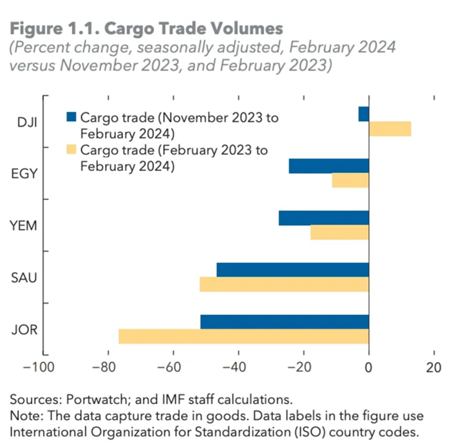 전 세계 무역의 12~15%가 수에즈 운하를 통과하기 때문에 홍해의 안보 위험은 분쟁이 무역 및 운송 비용에 미치는 영향에 대한 우려를 계속 불러일으키고 있다(UNCTAD 2024). 특히 이집트 경제는 2022/23년 수에즈 운하 통행료 수입으로 GDP의 약 2.2%(월 7억 달러 이상), 재정 수입으로 GDP의 1.2%를 차지할 정도로 이러한 차질에 큰 영향을 받고 있다. 11월 바브 엘 만데브 해협에서 첫 드론 공격이 발생한 이후부터 2월 말까지 수에즈 운하를 통한 교역량은 3,800만 톤에서 1,600만 톤으로 절반 이상 감소했다. 물동량 감소는 홍해 항구의 처리량 감소와 함께 다른 중동 및 아프리카 국가에도 영향을 미치고 있다. 예를 들어, 2월 말까지 아카바항을 통한 요르단의 수출입 물동량은 11월 중단 이후 절반 가까이 감소했지만, 일부 무역 흐름은 다른 경로로 전환되었다. 사우디아라비아에서는 당국이 페르시아만의 담맘 항구로 교통량을 이동시키면서 제다 항구의 활동이 감소했다.