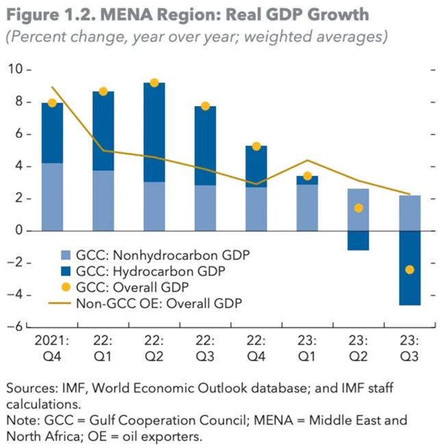2023년 중동 및 북아프리카(MENA) 석유 및 가스 생산국들은 자발적인 감산 결정을 통해 성장을 주도했다. 특히 걸프협력회의(GCC) 국가들은 일부 OPEC+ 국가들의 여러 차례 자발적 감산으로 인해 탄화수소 성장률이 현저히 둔화되었다. 그 결과, 경제 다각화를 위한 개혁의 지속적인 혜택, 높은 내수, 총자본 유입에도 불구하고 GCC의 실질 GDP 성장률은 0.4%로 급격히 둔화되었다. 석유 수출 증가(이란, 리비아)와 취약성(이라크)이 반영된 국가 간 이질성으로 인해 비GCC 석유 수출국의 활동은 대체로 안정적이었다.