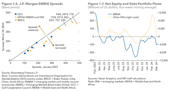 글로벌 신흥국이 연준 긴축의 충격에서 회복하는 가운데, MENA(중동 및 북아프리카) 지역은 예외적인 상황이다. 2023년 이후 이 지역은 자본 이탈이 지속되고 있으며, 레바논, 파키스탄, 튀니지는 여전히 심각한 재정난에 처해 있다.