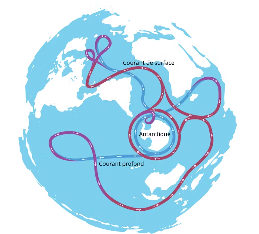 지구 해양 순환. 파란색 경로가 심해 해류를, 빨간색 경로가 표층 해류를 나타낸다. 남극 대륙을 돌고 있는 남극 환극 해류는 다른 모든 해양을 연결하므로 이 지구 순환에서 핵심적인 역할을 한다. 출처: 위키백과에서 각색 및 번역, 저자 제공.