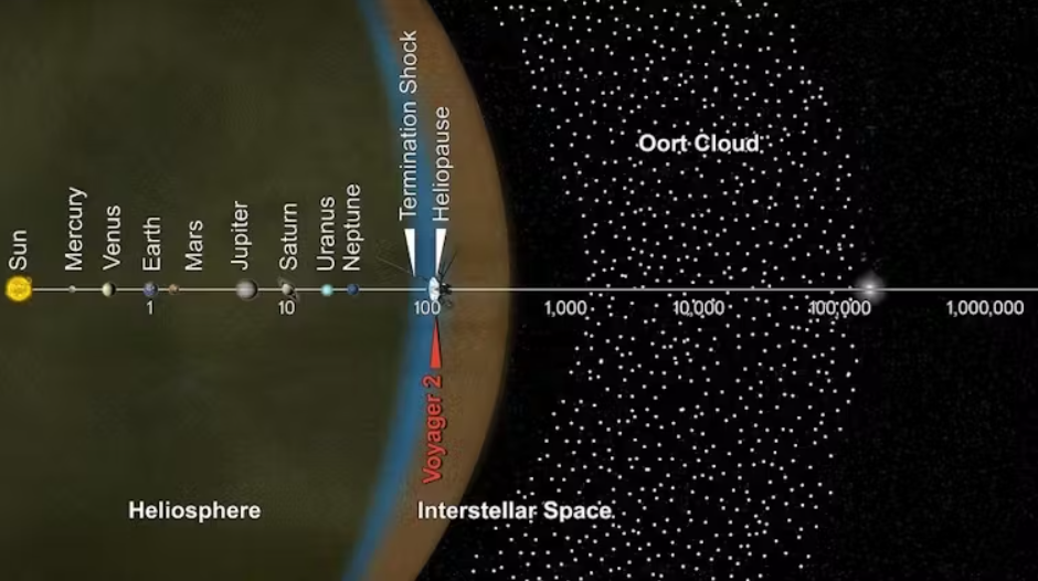 태양계와 오르트 구름의 그림. 그래프의 숫자는 AU, 즉 천문 단위를 나타낸다. 보이저 2호의 위치에 주목하자. 보이저 2호는 앞으로 30,000년이 더 걸려서 클라우드 밖으로 날아가야 한다. 출처: NASA