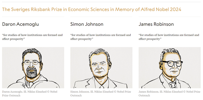 대런 아세모글루(Daron Acemoglu), 사이먼 존슨(Simon Johnson), 제임스 A. 로빈슨(James A Robinson)이 경제학 분야에서 노벨상(사실은 스웨덴 국립은행 경제학상)을 수상한 이유는 "제도 형성과 그것이 번영에 미치는 영향에 대한 연구" 때문이다. 대런 아세모글루는 매사추세츠 공과대학교(MIT) 교수이고, 사이먼 존슨도 같은 대학의 교수이며, 제임스 로빈슨은 시카고 대학교의 교수이다.