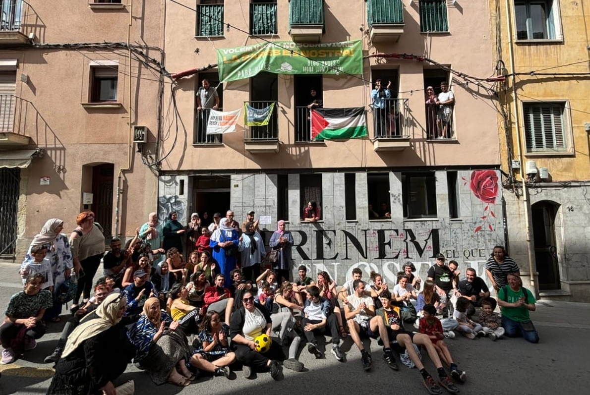 2024년 5월 5일, 카탈루냐 만레사의 파블로와 나디아가 거주하는 재개발된 건물 밖에서 PAHC 회원들이 점거 1주년을 기념하고 있다. 출처: PAHC