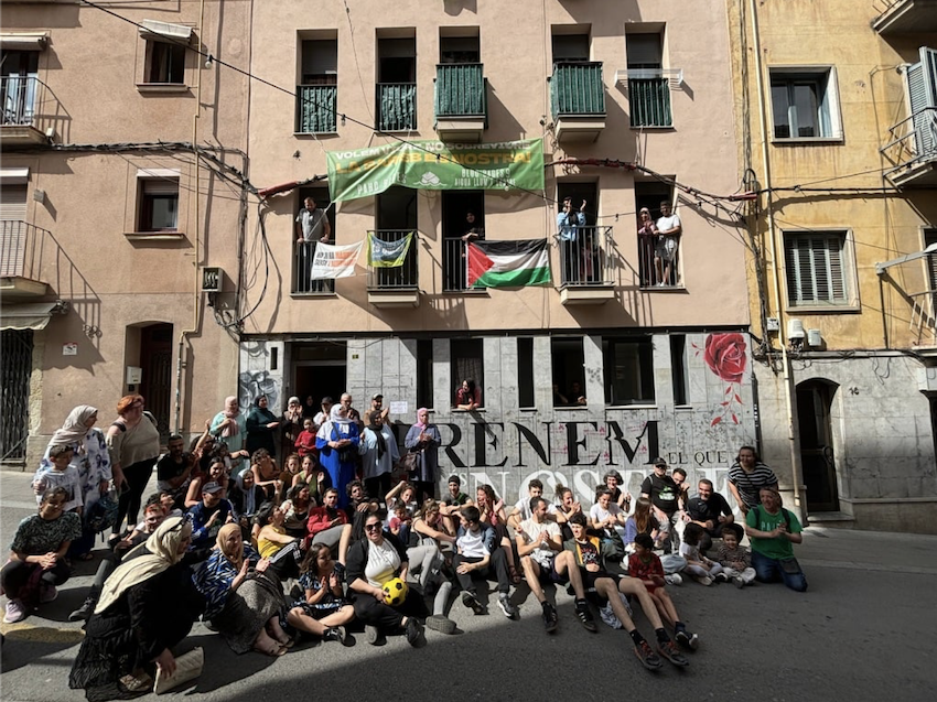 2024년 5월 5일, PAHC 회원들이 카탈루냐 만레사의 재점거된 건물 밖에 모여 점거 1주년을 축하하고 있다. 출처: PAHC