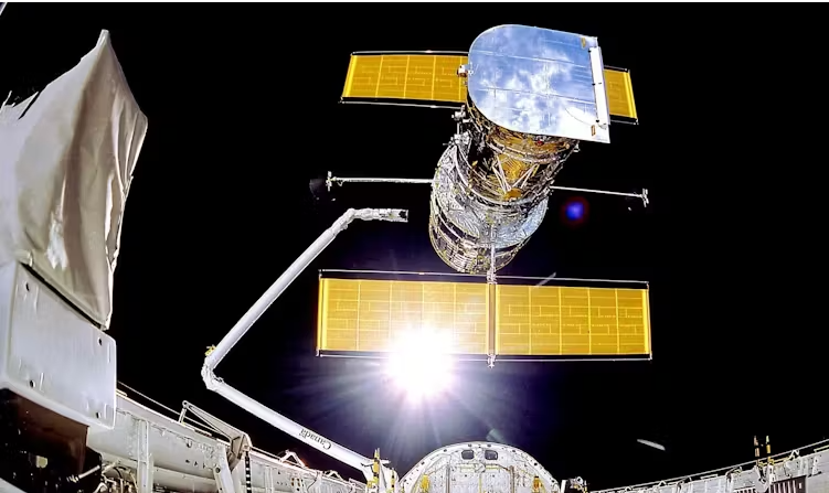 1990년 4월 우주왕복선에서 전개되는 허블 우주망원경. Nasa/Smithsonian Institution/Lockheed Corporation