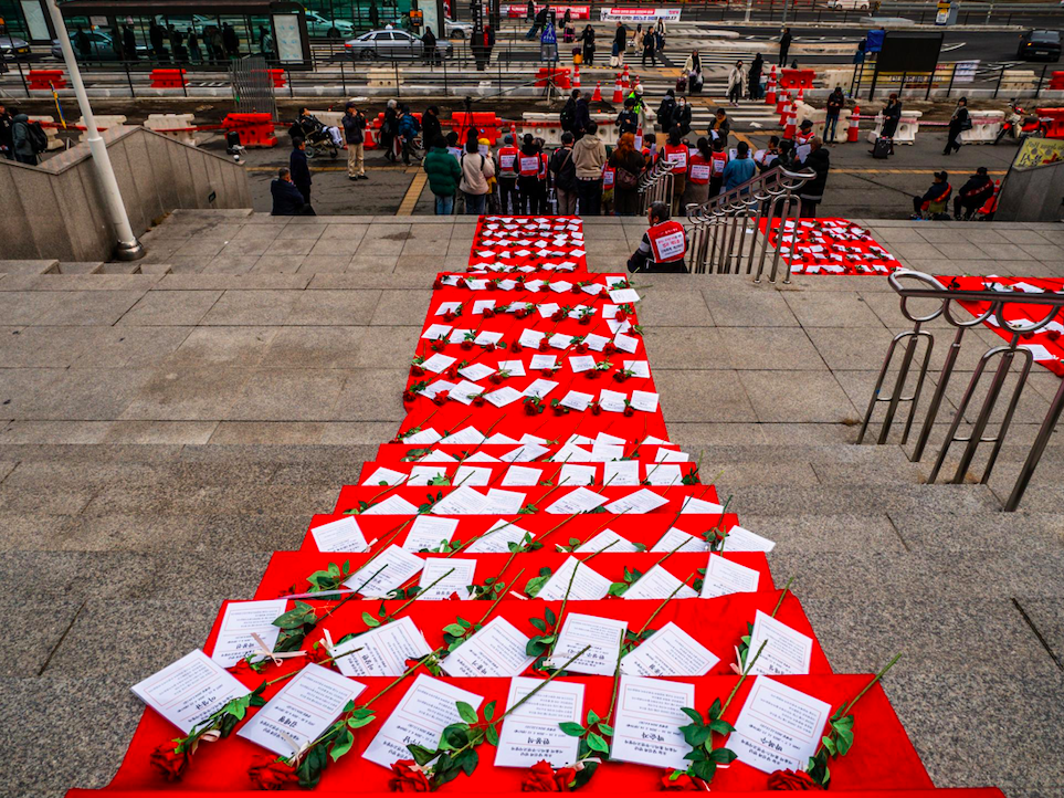 서울역 광장 계단을 덮은 붉은 빛 카펫 위로 흰 종이들이 각각 한 송이의 장미꽃과 함께 자리했다. 종이에 적힌 것은 목숨을 잃은 무연고·홈리스 사망자들의 이름과 생이었다.