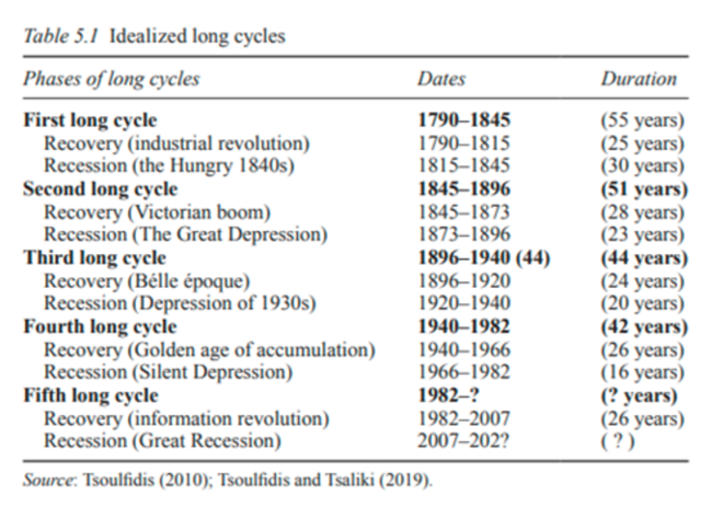 내가 이 모든 말을 하는 이유는최근에 장기 순환과 경제 성장을 최신 데이터를 통해 살펴보고 자본주의에서 이러한 장기 순환을 식별하려는 새로운 책이 출간되었기 때문이다저자들은 뉴욕의 뉴스쿨 사회연구소(New School for Social Research)의 그리스 마르크스주의 경제학자 니콜라오스 하차라키스(Nikolaos Chatzarakis), 테살로니키 아리스토텔레스 대학교의 페르세포니 찰리키(Persefoni Tsaliki), 마케도니아 대학교의 레프테리스 츠울피디스(Lefteris Tsoulfidis)이다.