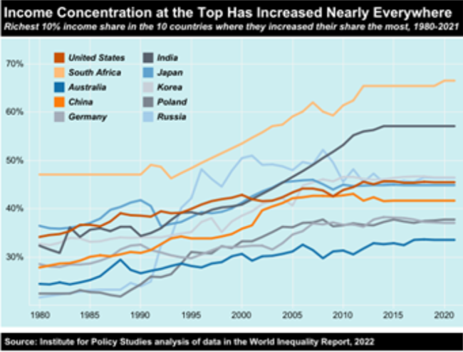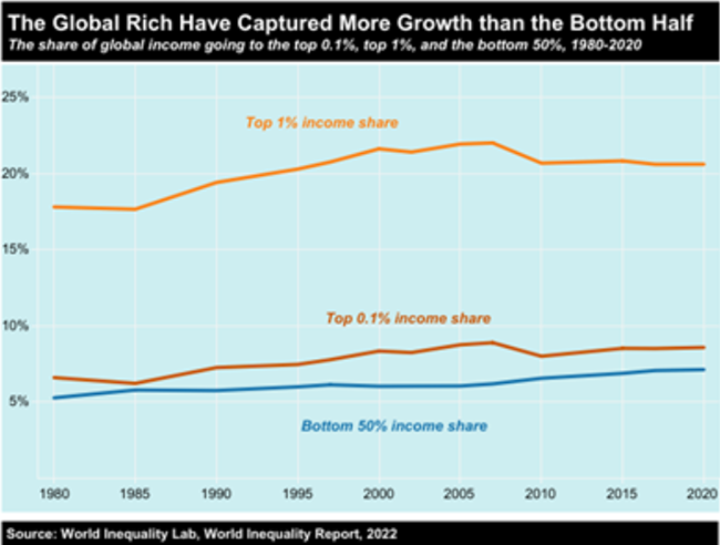 아시아(특히 중국과 인도)의 급격한 경제 성장으로 많은 사람들이 극심한 빈곤에서 벗어났지만세계 불평등 보고서에 따르면 경제 성장의 대부분의 이익은 전 세계 최상위 0.1%와 1%가 가져갔다. 2020상위 1%는 전 세계 소득의 20.6%를 차지했으며이는 1980년보다 2.8%포인트 증가한 수치다상위 0.1%는 2020년 전 세계 소득의 8.59%를 차지했으며이는 1980년보다 1.98%포인트 증가한 것이다이 초고소득 계층은 2008년 금융 위기 당시 타격을 받았으나상위 0.1%는 2007년에 누리던 전 세계 소득 점유율을 거의 회복했다.