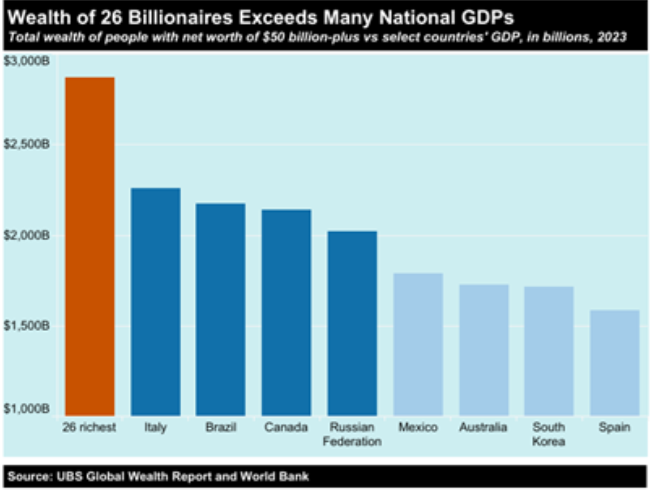 최신 UBS 글로벌 부 보고서에 따르면, 2023년 기준 세계에서 가장 부유한 억만장자 26명이 소유한 자산은 총 2조 8,720억 달러에 달했다이들의 총 자산은 세계은행의 GDP 데이터에 따르면 대부분의 국가가 연간 생산하는 총 상품 및 서비스 가치를 초과하는 규모다.