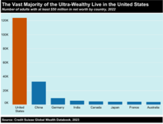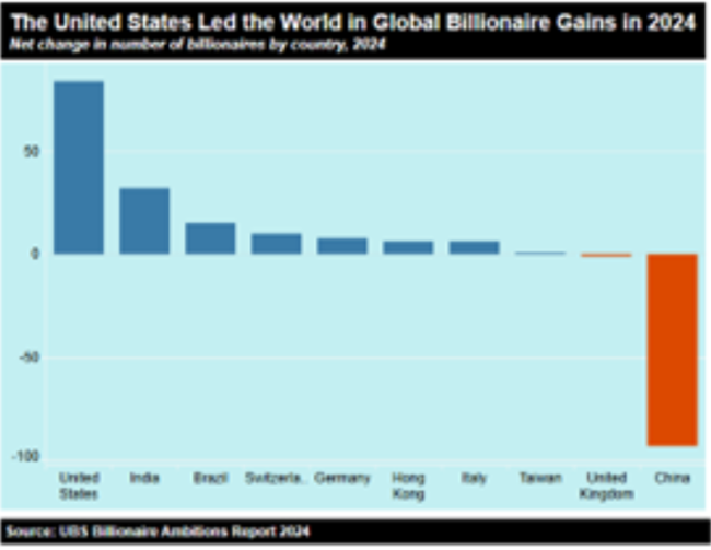 UBS 억만장자 야망 보고서(UBS Billionaire Ambitions Report)에 따르면, 2024년 미국은 다른 국가들에 비해 억만장자 계층의 가장 큰 확장을 기록했다스위스 기반 투자은행의 집계에 따르면미국의 억만장자 수는 2023년 751명에서 2024년 835명으로 증가했다반면중국은 부동산 위기와 금융시장 혼란으로 인해 새로운 억만장자들이 10억 달러 자산 기준 아래로 밀려나면서 9자리 수 자산 보유자 클럽이 520명에서 427명으로 줄어들었다.