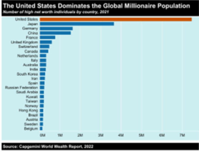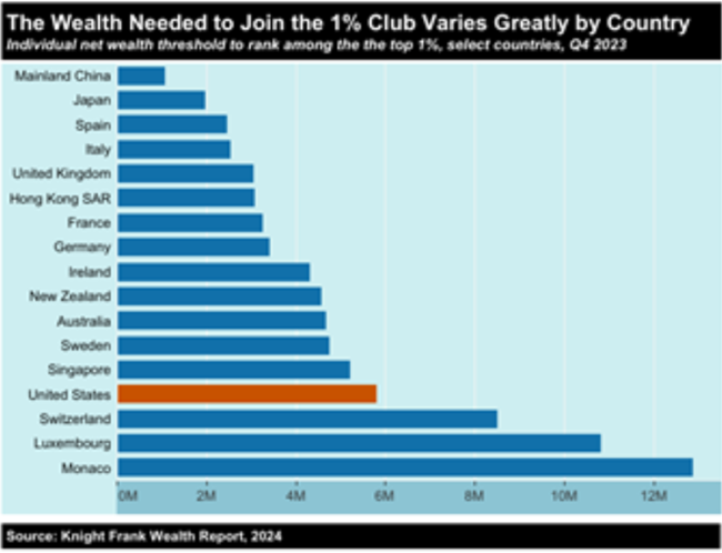 부의 집중은 거의 모든 국가에서 증가하고 있지만각국에서 상위 1%에 속하기 위해 요구되는 부의 기준은 상당히 다르다나이트 프랭크 웰스 리포트(Knight Frank Wealth Report)에 따르면미국에서 상위 1%에 들기 위해서는 최소 580만 달러의 자산이 필요하다이는 세계 2위 경제 대국인 중국에서 상위 1%에 들기 위한 최소 자산 기준의 5.4배에 해당하며, 3위 경제 대국인 독일의 기준보다 1.5배 많다.