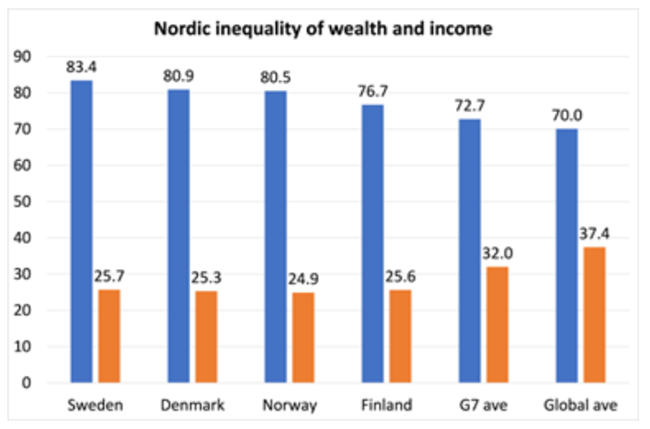 소득과 부의 분포에 대해 각국의 지니 지수를 비교하면 그 차이는 놀라울 정도다몇 가지 예를 들어보자미국의 소득 분포 지니 지수는 37.8로 상당히 높은 수준이지만부 분포 지니 지수는 무려 85.9에 달한다또는 평등주의로 알려진 스칸디나비아를 살펴보자노르웨이의 소득 지니 지수는 단 24.9에 불과하지만부 지니 지수는 80.5에 이른다다른 북유럽 국가들에서도 비슷한 상황이 나타난다북유럽 국가들은 평균보다 낮은 소득 불평등을 보이지만부의 불평등은 평균보다 훨씬 높은 수준이다.