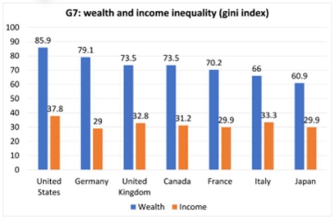 그럼에도 미국은 G7 선진 경제국들 중에서 부와 소득 불평등의 측면에서 독보적인 선두를 차지하고 있다.