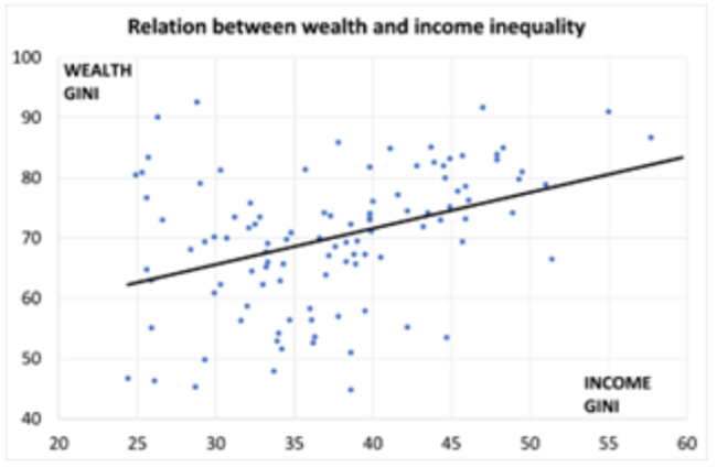 실제로부의 불평등이 소득 불평등과 밀접하게 연관되어 있는지 알아볼 수 있을까세계경제포럼(WEF) 지수를 사용한 분석에서약 0.38의 양의 상관관계가 발견되었다이는 한 경제에서 개인 부의 불평등이 높을수록 소득 불평등 또한 높을 가능성이 크다는 것을 시사한다.