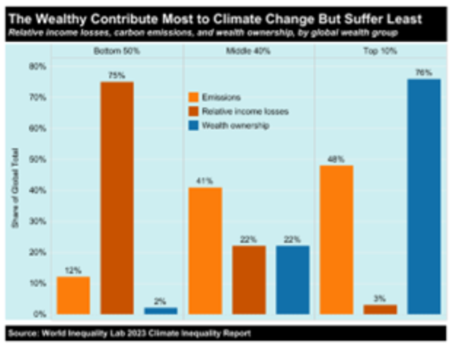 소득과 부의 이 극단적인 집중이 초래하는 또 다른 부산물은 세계 인구 하위 50%가 전 세계 탄소 배출량의 12%만을 책임지고 있지만기후 변화가 없는 세계와 비교했을 때 이들의 소득 손실의 75%에 노출되어 있다는 점이다.